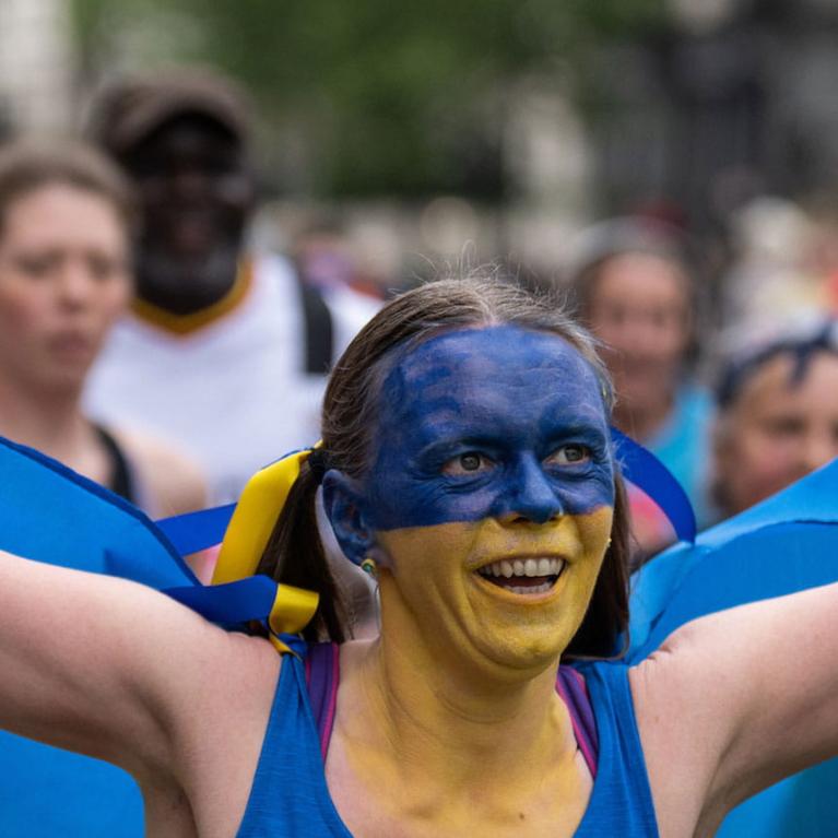 Londoner Laura Donnelly and her partner Clint Weirich were two of the Run for Ukraine participants who wore the blue and yellow of the country’s flag as a symbol of their support: “I’ve only got one word for the atmosphere: goosebumps,” said Clint. “The DJ played You’ll Never Walk Alone as we waited for the race to start, so that was a pretty special moment.”